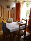 The cottage has an open lounge on the ground floor with a kitchen and dining area. There is a sofa bed and two armchairs. There is a raised hearth with log burning stove, telephone, WiFi, satellite TV and bookshelves. The kitchen has a microwave, fridge, gas hob, oven and central heating combi boiler which supplies instant hot water and heating to radiators in all the rooms. On the first floor there is a small double bedroom overlooking the river with exposed roof timbers. There is also a second small single bedroom containing bunk beds. The bathroom has a bath and a shower.